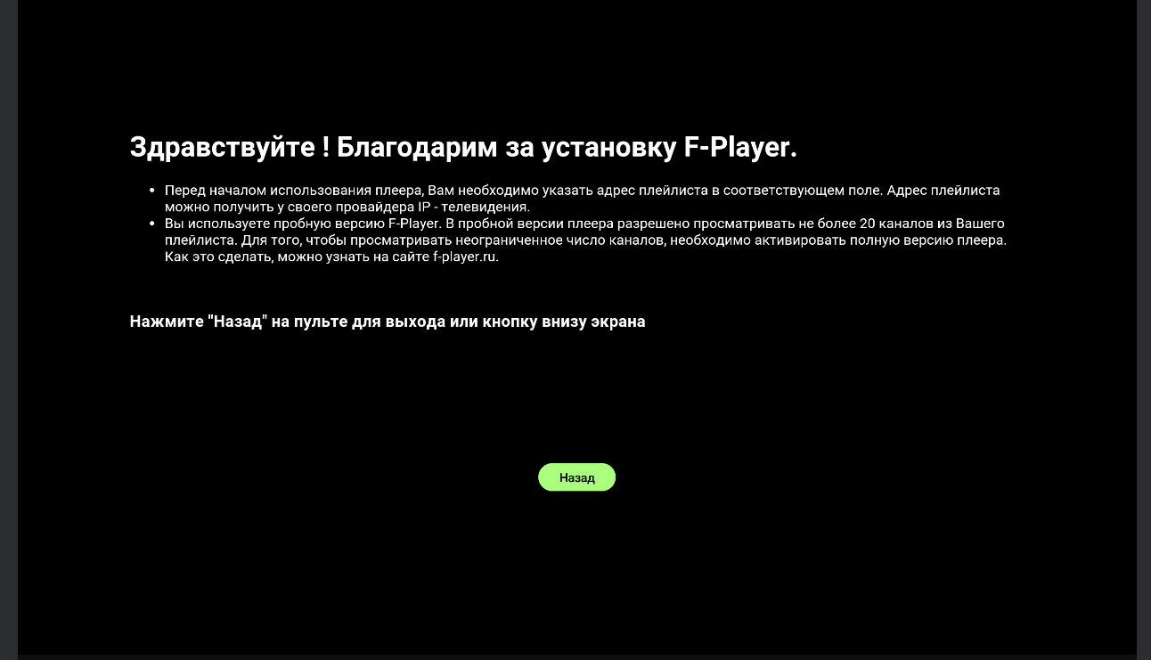 Для того чтобы снять ограничение на количество каналов необходимо приобрести пин - код на сайте плеера (https://f-player.ru). После успешной оплаты через пин - код для разблокировки полной версии будет выслан на Ваш адрес электронной почты указанный при оплате. Один пин - код можно использовать одновременно на одном телевизоре, срок действия пин - кода - один год с момента покупки. При разблокировке полной версии приложения данные о лицензии и копии программы хранятся в облаке плеера. В случае попытки разблокировки другой копии программы этим – же пин-кодом – сведения о лицензии обновляются и разблокированным считается только тот плеер, в котором пин – код был введен последним.